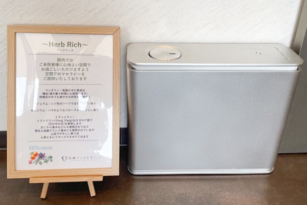 当院では、ご来院者様に少しでも心地よい空間でお過ごしいただけますよう、「空間アロマセラピー」をご提供させて頂いております。